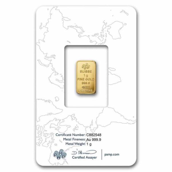 - The accompanying assay card lists the weight and authentication of the bar by the assayer.